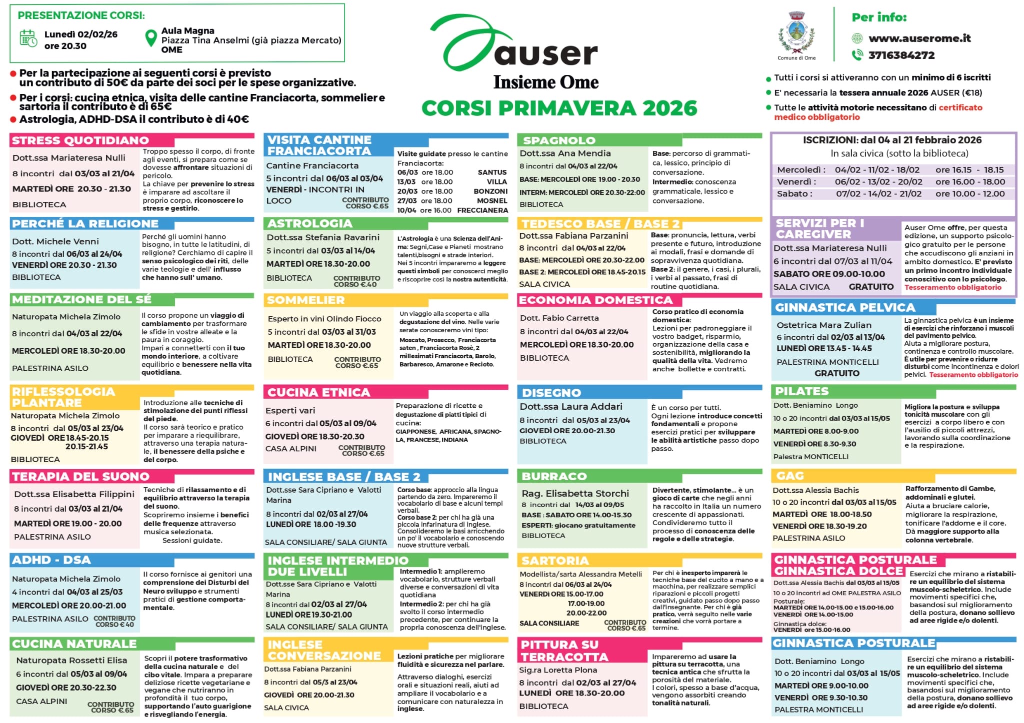 , dal lunedì al venerdì dalle ore 13 alle 14 e dalle ore 18 alle ore 20, oppure recati presso la sede di Auser Insieme Ome APS-ETS nei giorni di iscrizione ai corsi.