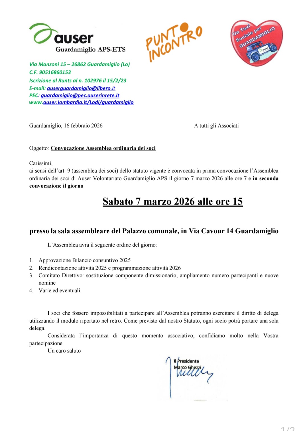 Assemblea ordinaria dei soci sabato 7 marzo 2026 alle ore 15:00 presso la sala assembleare del Palazzo comunale, in via Cavour 14 Guardamiglio.