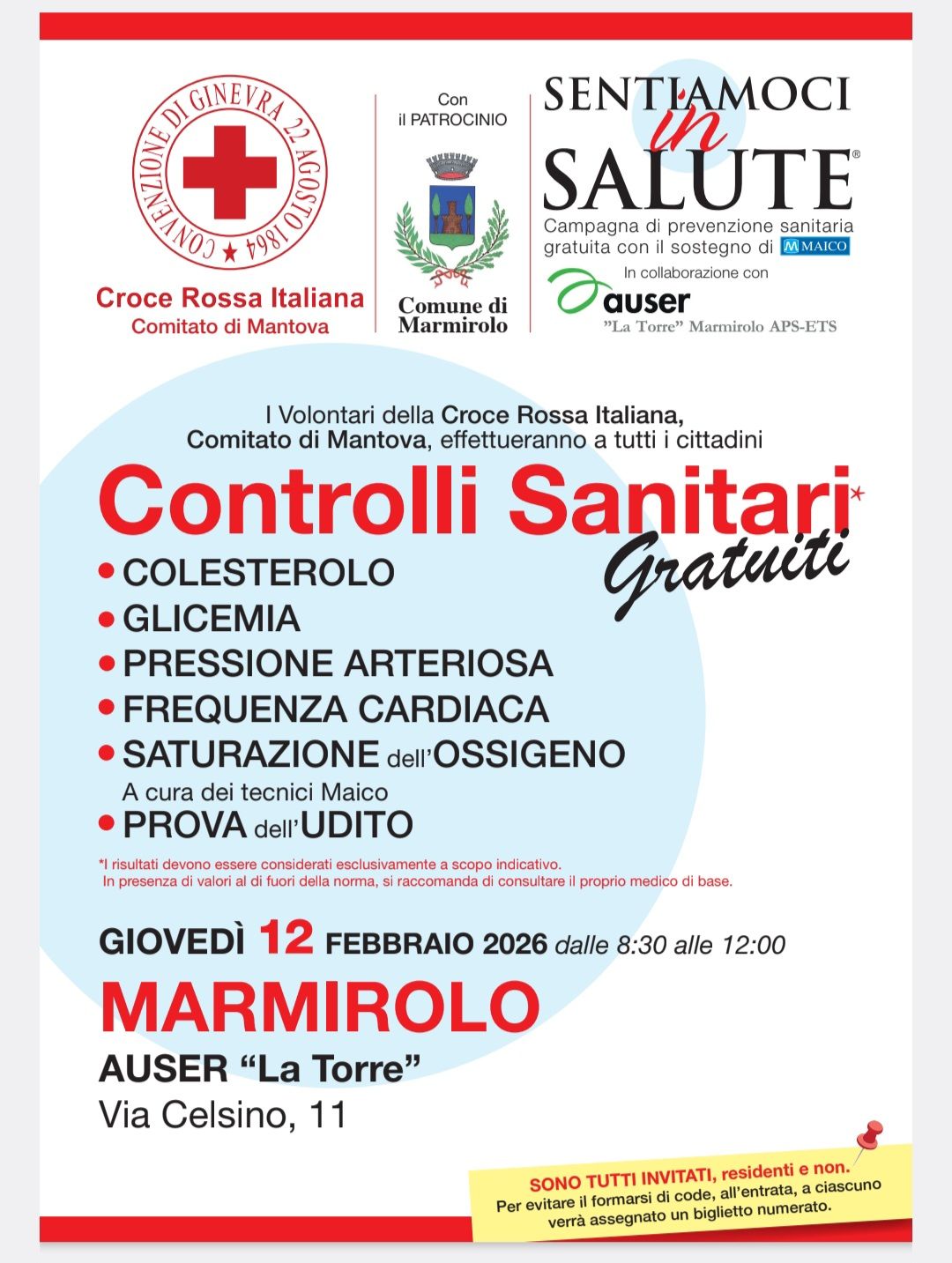 Grazie alla collaborazione con Auser La Torre Marmirolo, il Comune patrocina la Campagna di Prevenzione "SENTIAMOCI IN SALUTE" di Croce Rossa Italiana - Comitato Locale di Mantova.