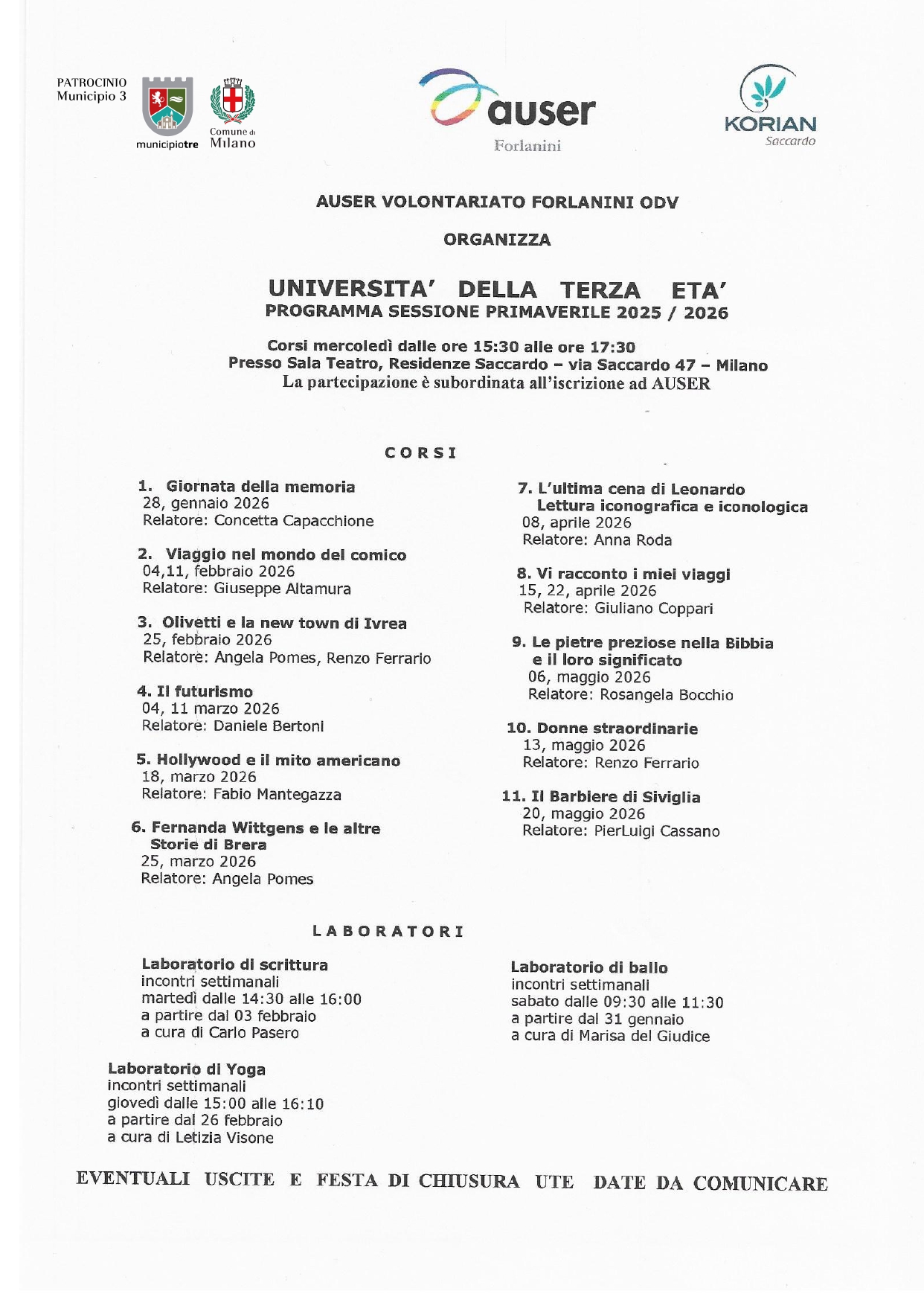 L'Università della Terza Eta’ e’ ormai un punto d’incontro consolidato tra gli ospiti delle Residenza Saccardo, i loro familiari, i soci dell’Auser e gli abitanti del Municipio 3, istituendo rapporti di buon vicinato e di solidarietà tra anziano in salute ed anziano fragile.