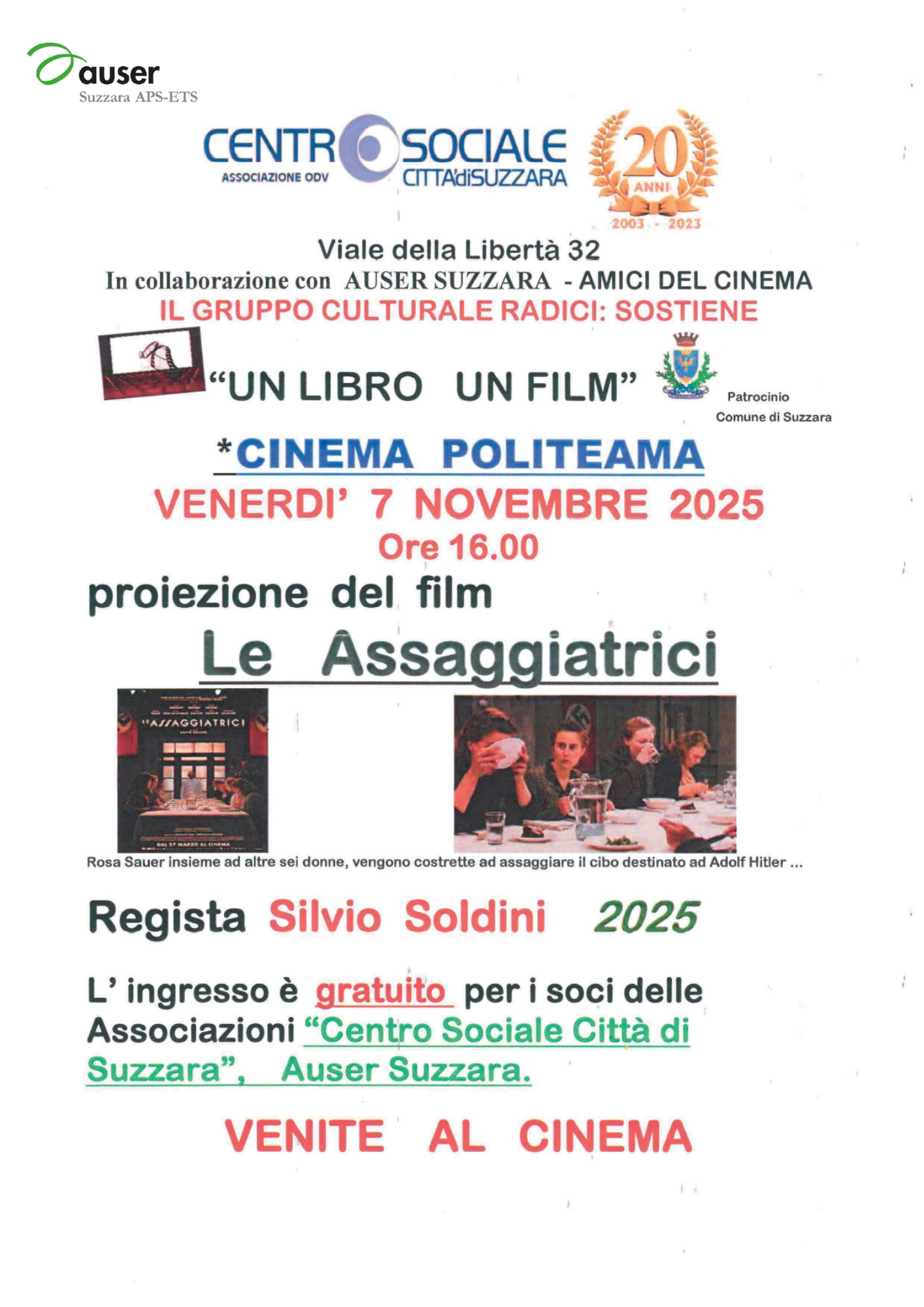 Venerdì 7 novembre 2025 Auser Suzzara vi aspetta per la proiezione del film "Le assaggiatrici", un'intensa e toccante storia ispirata al romanzo pluripremiato di Rossella Postorino.