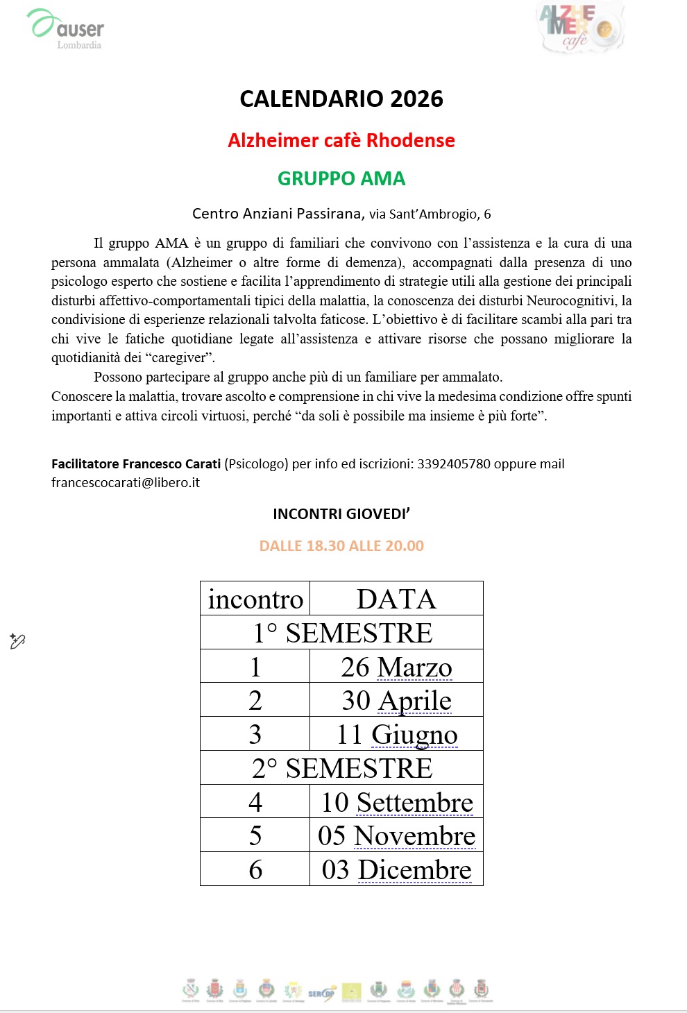 Informazioni anche presso la Segreteria Organizzativa (info@adcafe.it) o tramite i volontari (alzheimercafe.rho@gmail.com).