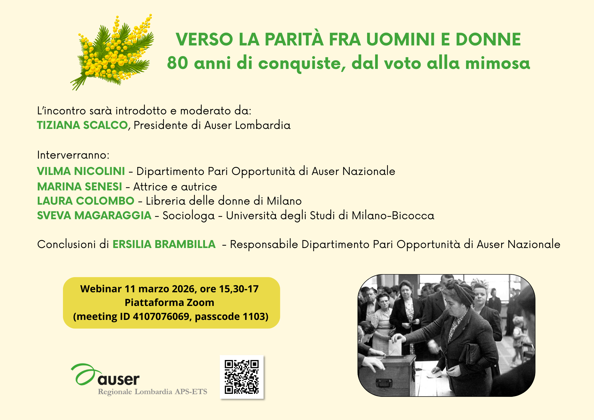 Tanti spunti di riflessione brillanti dalle relatrici del webinar "Verso la parità fra uomini e donne - 80 anni di conquiste, dal voto alla mimosa", organizzato da Auser Lombardia nell'ambito della Giornata Internazionale della Donna 2026: ora puoi vedere gli estratti del webinar nella sezione VIDEO del sito, clicca qui!